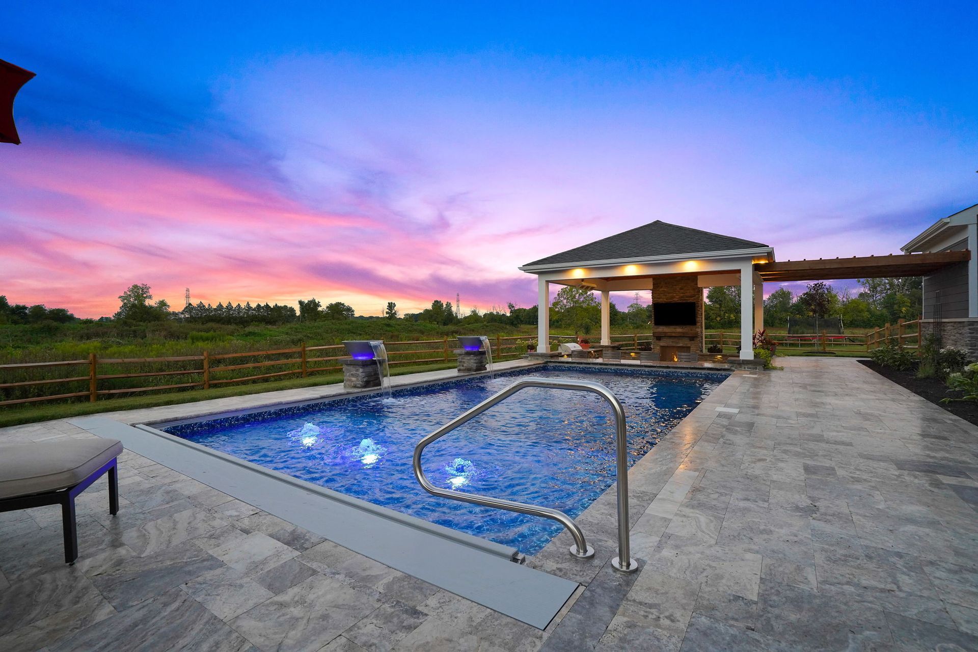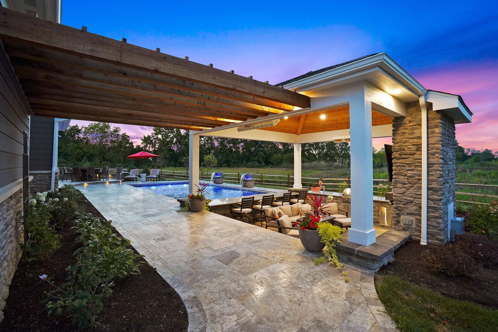 Gorgeous step down covered pavilion with outdoor kitchen, stone veneer gas fireplace and swim up bar. A cedar pergola attaches the house to the pavilion. The vinyl pool not only has a swim up bar, but also has bubblers, built in sun ledge and 2 fire and water bowls. The patio steps up into a dining area with seat wall and columns. This project is all tied together by the pressure treated split rail fencing.